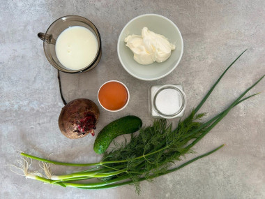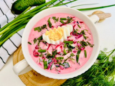 Литовский холодный борщ готовлю впервые. Свеклу и яйца отварила до готовности и остудила. Затем натерла на крупной терке свеклу и белок. Огурцы нарезала кубиками. Укроп с зеленым луком мелко нарезала, смешала с солью и растерла. Сметана у меня была густая 20%, я ее смешала с частью кефира и желтком, натертым на мелкой терке. Перемешала все ингредиенты и залила оставшимся кефиром. Рецепт очень понравился. Он получился таким освежающим и лёгким, идеально подходит для летнего обеда. Спасибо за такой вкусный и простой рецепт!