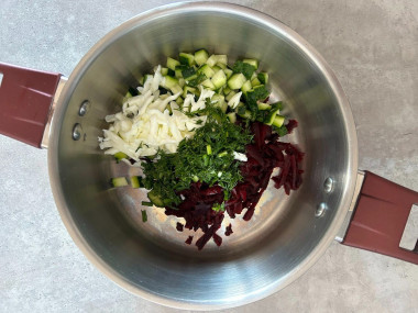 Залейте всё кефиром. Дайте борщу настояться около получаса. Кефира можно заменить на пахту, йогурт, айран, простоквашу, сыворотку. Если суп будет слишком густым, его можно разбавить холодной кипяченой водой. Употреблять холодный борщ надо свежим, после хранения он теряет свои вкусовые качества. Иногда при подаче в него добавляют кубики льда. Приятного аппетита!