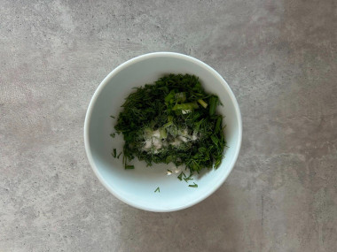 Укроп и лук мелко порежьте и хорошо разотрите с солью. Удобно делать это в ступке.