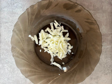 Яйцо разделите на белок и желток, белок натрите на крупной терке.