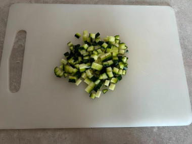Огурец очистите от кожицы и также натрите на терке. По желанию огурец тоже можно нарезать кубиками ии брусочками.