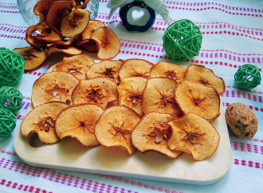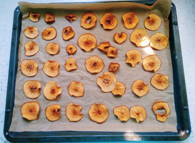 Я тоже люблю фруктовые чипсы) Обычно сушу их в электросушилке, но почему бы не приготовить их в духовке! Тем более в сушилке уж точно не добавишь сахар. На большом противне у меня уместилось как раз три яблока среднего размера. Посыпала ванильным сахаром, а корицу не добавляла, мне больше без нее нравится. Сушились яблоки дольше двух часов, потом еще температуру выставила 70 градусов. Но в итоге получились очень вкусные чипсы. Правда они не стали совсем хрустящими, совсем чуть-чуть гнулись, но сырыми точно не были. Аромат яблок и ванили чувствовался во всем доме) Мы эту порцию съели сразу за ужином, со свежим чаем хорошо сочетается. Спасибо за рецепт!