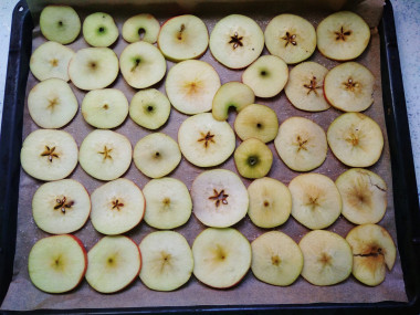 Противень выстелите пергаментом для выпечки. Правильно выбрать пергаментную бумагу вы сможете, прочитав отдельную статью про особенности пергамента, ссылка есть в конце рецепта. Разложите на пергамент ломтики яблок, чтобы они не наслаивались друг на друга или соприкасались друг с другом по минимуму, иначе те части, которые лежат друг на друге плохо просушатся.