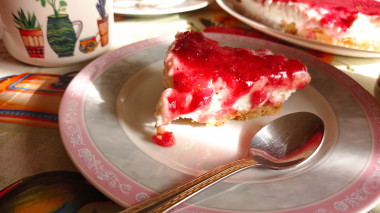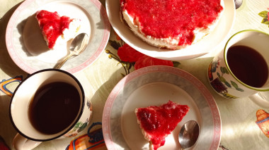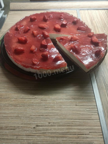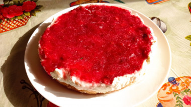 Для приготовления этого торта я взяла рикотту, приготовленную в домашних условиях. Это значительно снизило себестоимость. Чтобы приготовить ее дома, надо взять литр молока, довести его почти до кипения, но не кипятить, и влить 4 ст.л. лимонного сока. Молоко свернется и отойдет сыворотка. Смесь надо остудить и откинуть на сито на марлю. Домашняя рикотта готова! Вот маскарпоне я бы не заменяла, он придает торту нежный сливочный вкус. Если все-таки решите ее заменить, то возьмите густую сметану или жирные сливки. Если начинка покажется жидковатой, можно добавить желатина, чтобы стабилизировать ее. Мне желатин не потребовался, и рикотта, и маскарпоне были густыми. Джем для покрытия я также приготовила сама. Взяла замороженную вишню без косточек и сварила ее с добавлением желфикса по инструкции. Получился замечательный вишневый джем всего за три минуты. Но вы можете брать любой готовый джем или варенье, только тогда сахар регулируйте по вкусу. Или можно сварить густой ягодный кисель, тоже будет вкусно. Ягоды берите с кислинкой, они компенсируют сладость сырной основы. Печенье подойдет любое, вкусно будет шоколадное или со вкусом топленого молока.