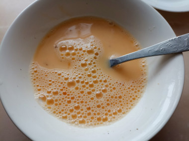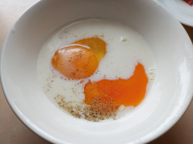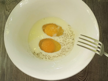 Яйца вбейте в небольшую миску или глубокую тарелку. Далее налейте немного холодного молока и взбейте все это венчиком или вилкой. Сильно взбивать яйца не нужно. Для омлета не нужна пышная пена из яиц, нужно лишь смешать яичные белки и желтки, а также молоко до однородной жидкой консистенции.