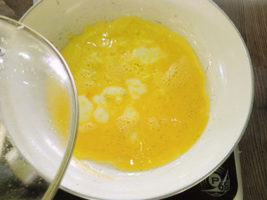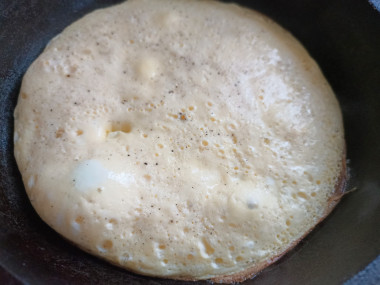 И сразу вылейте на горячую сковороду. Уменьшите огонь до минимального и накройте сковороду крышкой. В таком виде жарьте яйца в течение 7-10 минут ровно до того момента, как серединка омлета перестанет быть жидкой. Слабый огонь тут нужен, чтобы блюдо равномерно пропеклось со всех сторон. Точное время будет зависеть от особенностей работы вашей плиты и выбранной сковороды.