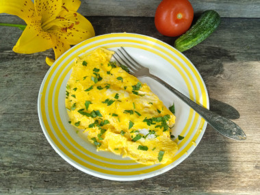 Готовый омлет при помощи лопатки сверните пополам и выложите на тарелку. Посыпьте блюдо свежей зеленью и подавайте к столу. Приятного аппетита!