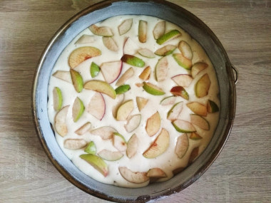 Возьмите подходящую форму для выпечки. У меня силиконовая, диаметром 22 см. Ее ничем смазывать не нужно, форму из другого материала смажьте кусочком сливочного масла. Вылейте в форму половину теста. На него равномерно разложите кусочки яблок и груш. С выбором формы для выпечки поможет статья по ссылке в конце рецепта.