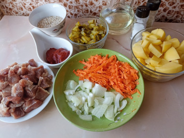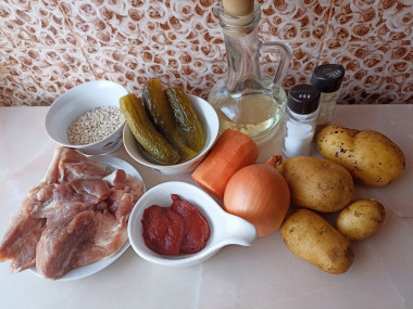 Как варить рассольник в мультиварке с перловкой? Подготовьте продукты. Мясо подойдет любое — свинина, курица, у меня говядина. Вкуснее получится суп на бульоне от мяса с косточкой. Традиционно рассольник варят с огурцами, солеными бочковым способом — без уксуса. Не найдете таких — берите обычные, маринованные. Овощи помойте и очистите.