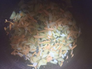 Отправьте морковь в чашу к луку, жарьте, помешивая, еще три минуты.