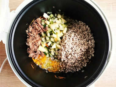 Залейте овощи с мясом горячей кипяченой водой или готовым бульоном. Немного посолите суп. Учитывайте, что в составе у него есть соленые огурцы, а позже мы добавим рассол. Не пересолите. Поставьте рассольник тушиться на подходящий режим на 2 часа. В моей модели это режим "тушение".