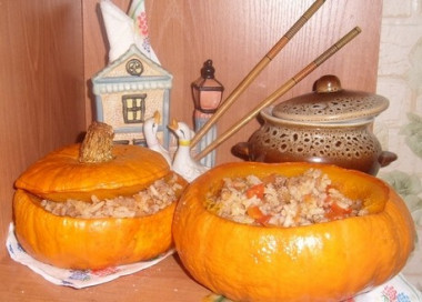 Блюдо готово! При таком способе запекания оно получается вкусным, сочным, нежным. Можно ускорить процесс приготовления, если наполнить тыкву уже готовыми продуктами: мясо и овощи отдельно друг от друга поджарить на сковороде, а тыкву проварить в мультиварке или пароварке. Но при таком способе вкус блюда изменится. Приятного аппетита!