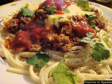 Готовое болоньезе в тарелке присыпать натертым пармезаном.