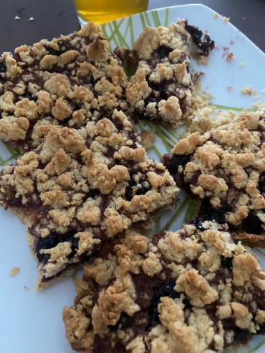 Испекла пирог во второй раз. Увеличила ингредиенты в два раза. Желток добавила только в тесто для нижнего коржа. Крошка стала чуть более влажной, но по форме распределялась хорошо. Чуть-чуть примяла её, потом выложила джем и сверху крошку. В результате после выпечки пирог хорошо режется, нижний корж перестал разваливаться, а верхняя крошка осталась рассыпчатой. Теперь этот пирог будет частым гостем на нашем столе! Майоран, ещё раз спасибо за рецепт!