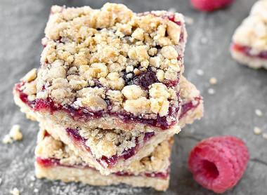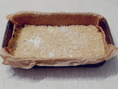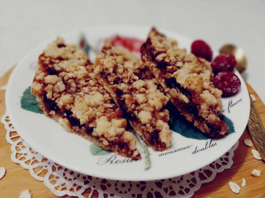 К чаю приготовила вкусный малиновый насыпной песочный пирог с вареньем. Вместо овсяных хлопьев использовала цельный «Геркулес», муку взяла самоподнимающуюся с разрыхлителем и солью. 2/3 крошки выложила на кондитерскую бумагу и придавила ко дну ложкой чтобы варенье было удобно распределять ровным слоем, а сверху посыпала крошкой. Выпекала в прямоугольной форме 30 на 20 см. Сахар использовала обычный белый, не увеличивая объем. Получился вкусный и быстрый в приготовлении пирог к чаю.
