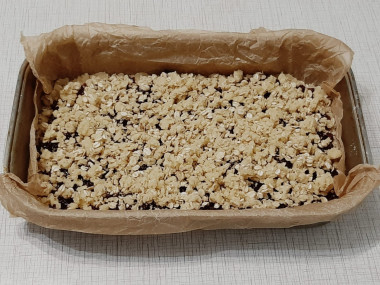 Сверху посыпьте оставшимся тестом. Немного прижмите для плотности. Поставьте пирог в духовку, предварительно разогретую до 180 градусов, на 25-30 минут. Ориентируйтесь по своей духовке.
