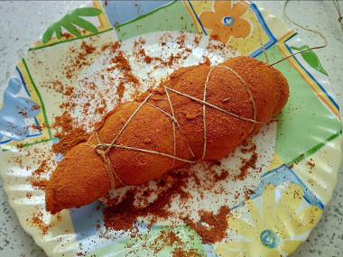 Возьмите чистую марлю, сверните в два слоя, плотно закрутите грудку. Обвяжите нитками. Можно сначала мясо убрать на 12 ч. в холодильник, а потом повесить вялиться в хорошо проветриваемое помещение с не высокой температурой на 2 - 5 дней. Но я сразу подвесила бастурму на не утеплённый балкон. Эти дни температура на улице была невысокая и на балконе было прохладно (не выше 10 гр.). Обязательно нужно следить, чтобы на мясо не попадали прямые солнечные лучи.