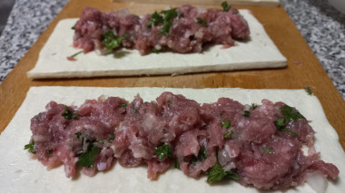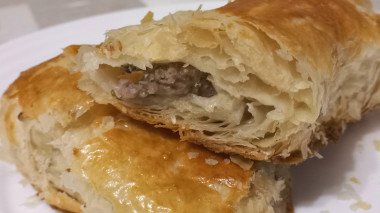 Слоёное тесто, предварительно разморозила при комнатной температуре. Размораживала недолго, т.к. с ним удобнее работать. Каждый пласт теста, разрезала пополам. Фарш выложила на тесто не доходя краёв. Тесто, аккуратно защипнула и получилась форма трубочек. Для лучшего защипывания теста, использовала куриный белок. Оставшийся куриный желток, слегка взбила и нанесла на пирожки. Пирожки поместила в духовку и выпекала до готовности.