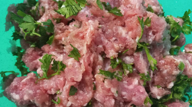 Решила приготовить пирожки из слоёного, дрожжевого теста с мясом в духовке. Для приготовления начинки пирожков, использовала индюшиный фарш. В фарш добавила репчатый лук, свежую зелень петрушки, посолила, поперчила.