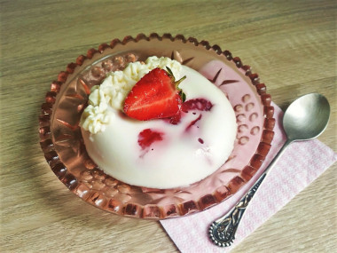 В качестве десерта приготовила молочное желе с желатином. У меня желатин быстрорастворимый порошковый. По инструкции на упаковке его надо использовать в количестве одной столовой ложки на 1-1,5 стакана жидкости. Поэтому взяла молока меньше, чем в рецепте, около 300 мл, прокипятила его, сняла пенку, соединила с сахаром и слегка остудила под крышкой. После разбухания желатин распустила на водяной бане, потому что кипятить его нельзя, и горячим добавила в молоко. Всю смесь остудила до комнатной температуры, так как собиралась ею залить свежие ягоды клубники. Вместо ванилина использовала ванильный сахар (0,5 чайной ложки). Застыло минут за 10-15 в холодильнике, но это, наверное, зависит от размера формы. Застывшее желе перевернула на блюдце и украсила, как говорят, "на свой вкус"))) Получился лёгкий летний десерт на основе молочного желе с желатином! Очень вкусный!