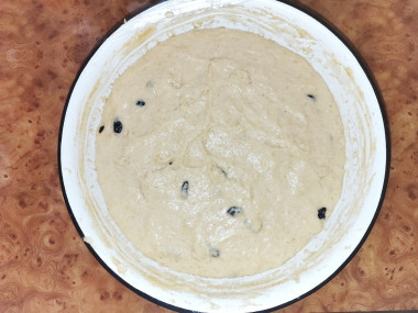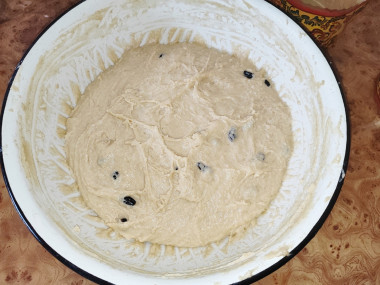 Влейте в готовую опару коньяк, всыпьте соль и ванильный сахар, добавьте помытый и обсушенный изюм. Перемешайте.