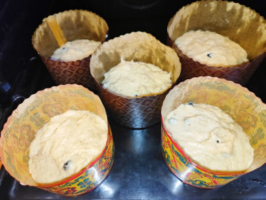 Разложите тесто по формам, заполняя их на треть. У меня получилось 5 формочек размером 10*8см. Оставьте их постоять примерно 15-20 минут, чтобы заготовки успели подняться (времени на расстойку может уйти чуть больше, тесто должно увеличится примерно в два раза). Включите духовку разогреваться до 180°С.