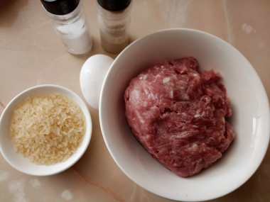 Подготовьте все необходимые ингредиенты для тефтелей. Фарш я использовала говяжий, но можно брать любой. О том, как правильно выбрать рис, читайте в отдельной статье по ссылке в конце рецепта.