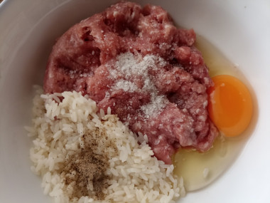 Рис промойте и откиньте на дуршлаг. В фарш добавьте рис, яйцо, чёрный молотый перец и соль по вкусу.