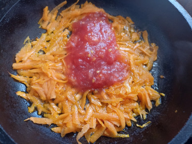Добавьте к моркови протёртый помидор и жарьте всё вместе 3-4 минуты. Чтобы суп получился еще более сытным, можно на этом этапе добавить болгарский перец, стручковую фасоль, мелко нарезанный лук.