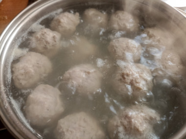 Добавьте в кипящую воду тефтели. Варите суп около 10 минут, снимая пену.