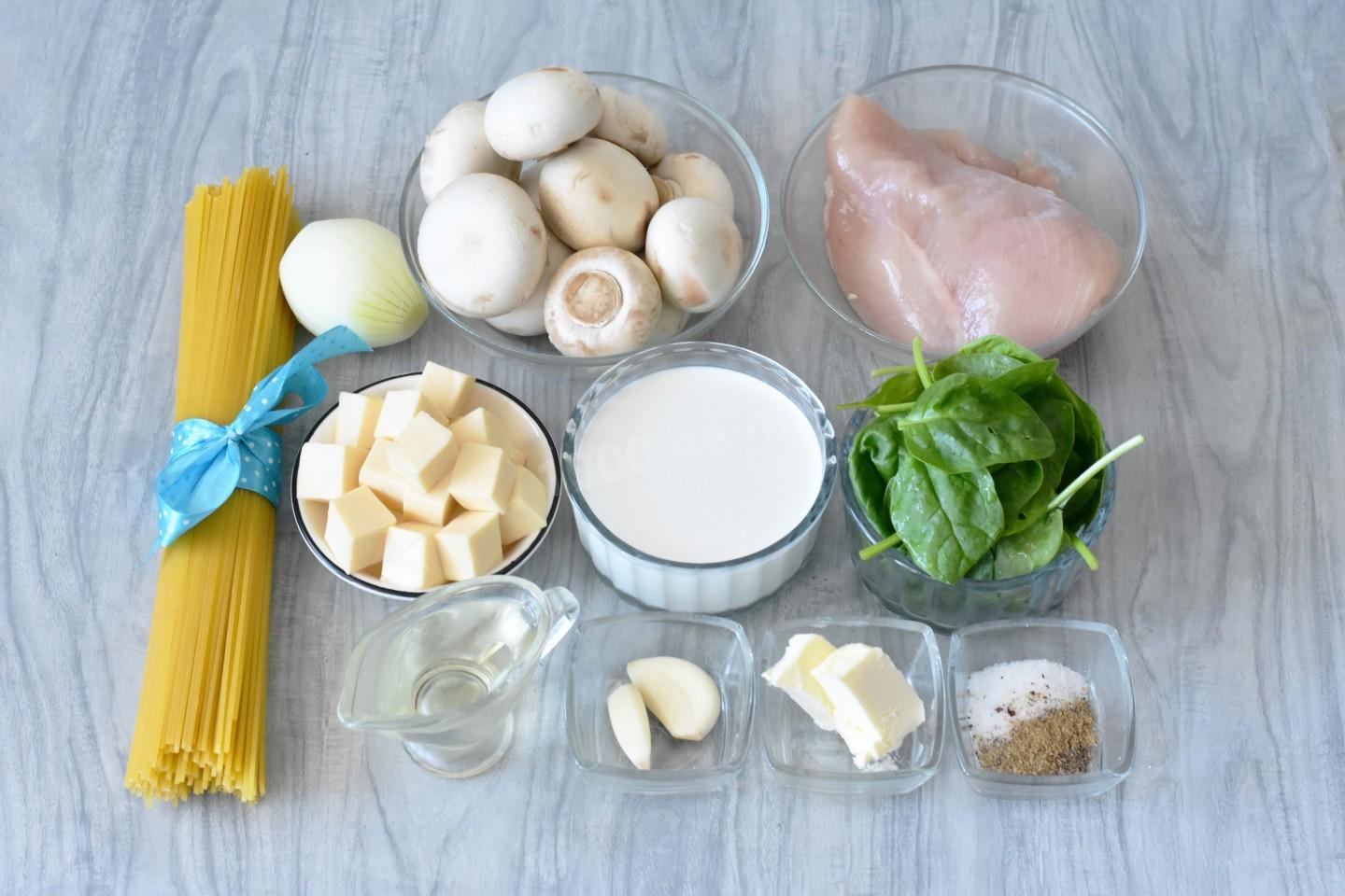 Подготовьте необходимые ингредиенты. Для блюда также подойдут любые макароны: длинные (спагетти, феттуччини, лингвини) или средние (пенне, фарфалле, фузили, и др.). Я остановилась на спагетти. Подробнее о тонкостях выбора макарон читайте в отдельной статье, ссылка в конце рецепта. Курицу можно заменить на индейку или на любой другой вид мяса по вашему желанию.