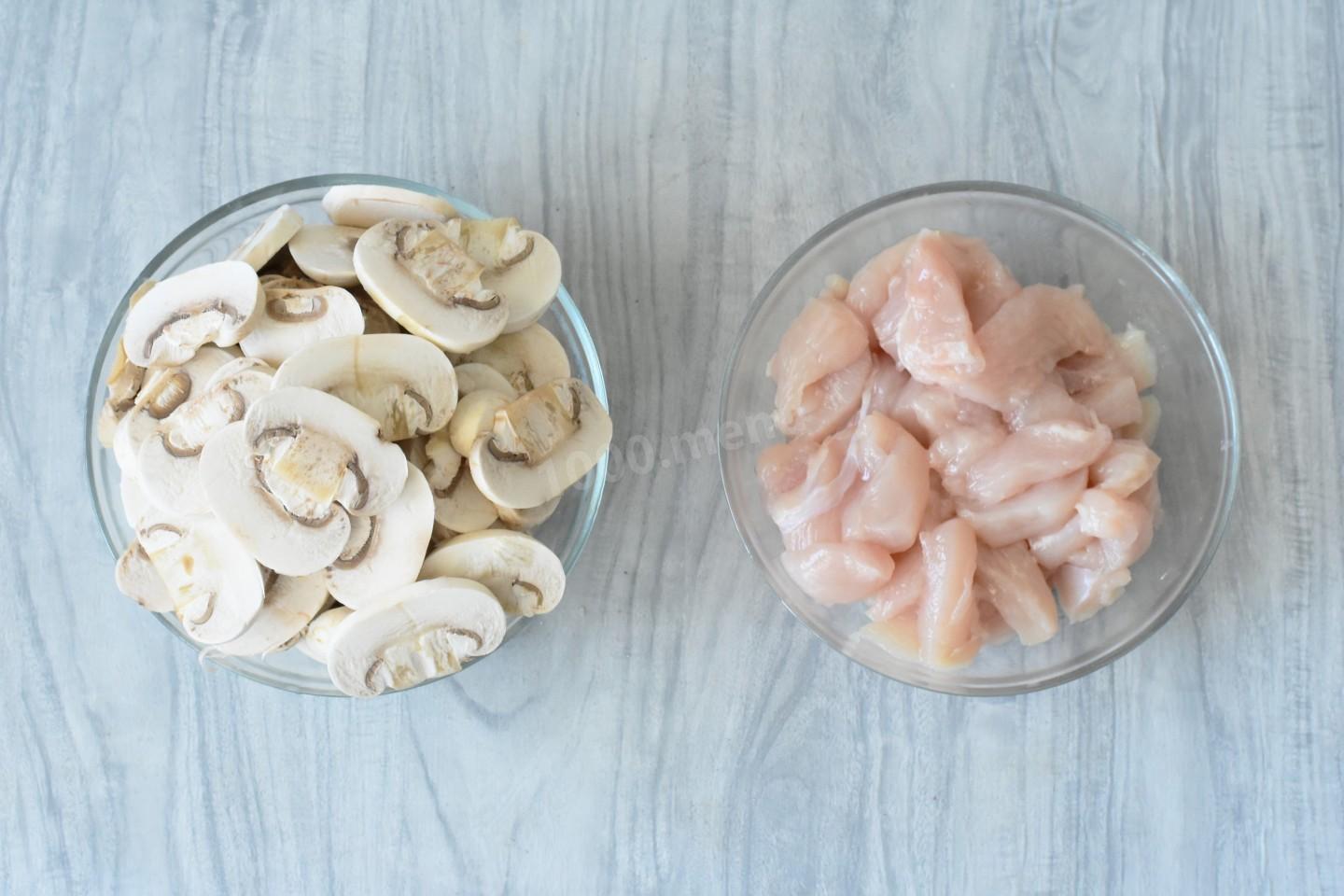 Куриное филе промойте, обсушите и нарежьте небольшими кусочками. Грибы вымойте и нарежьте пластинками. Грибы можете использовать как свежие, так и замороженные. Но учтите, что замороженных нужно брать на треть или на половину больше, потому что из них выпарится намного больше влаги. Покупайте свежие шампиньоны среднего размера, снежно-белого цвета без пятен, повреждений, запаха гнили.