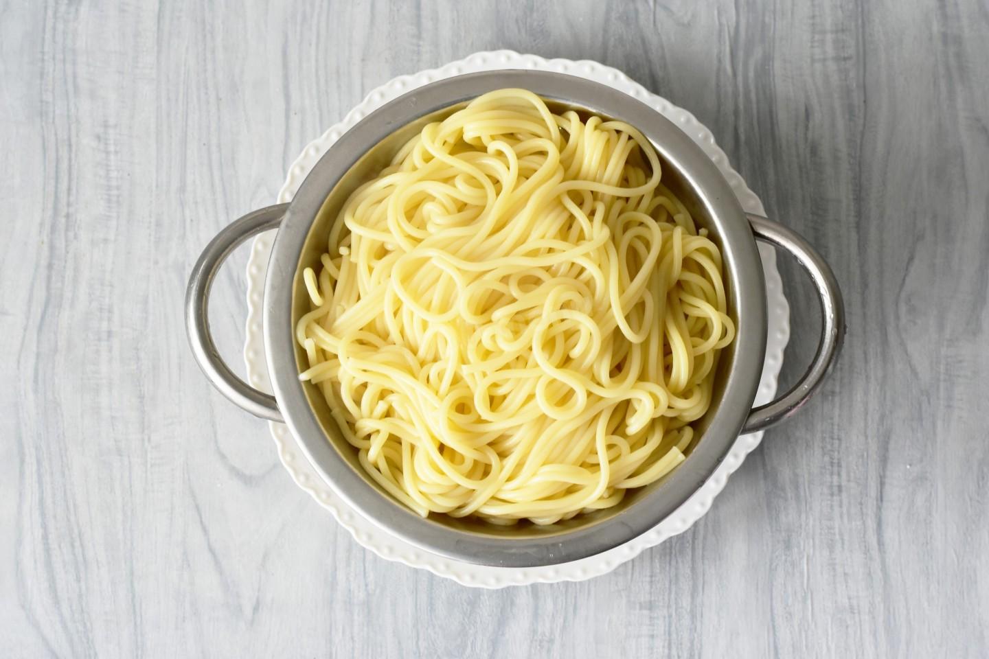 На плите вскипятите большое количество подсоленной воды из расчета: на 100 г пасты примерно 1 л воды и 1 ст. л. соли без горки. Выложите в воду спагетти и отварите до состояния al dente примерно 7-8 минут (на одну минуту меньше, чем указано на упаковке). Готовые спагетти откиньте на дуршлаг и дайте стечь воде.