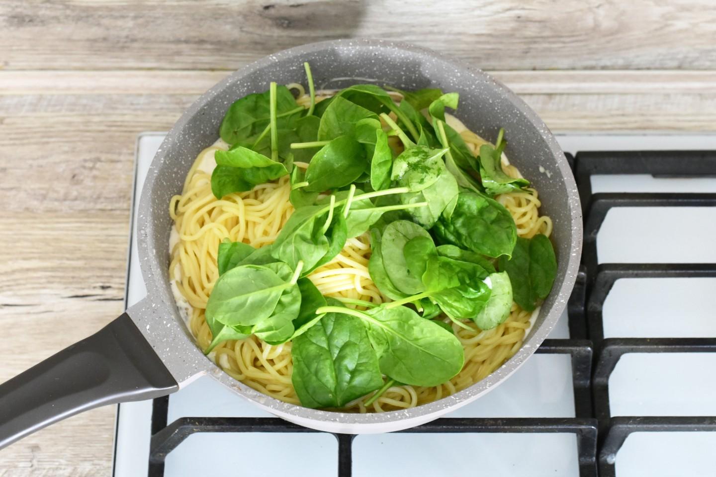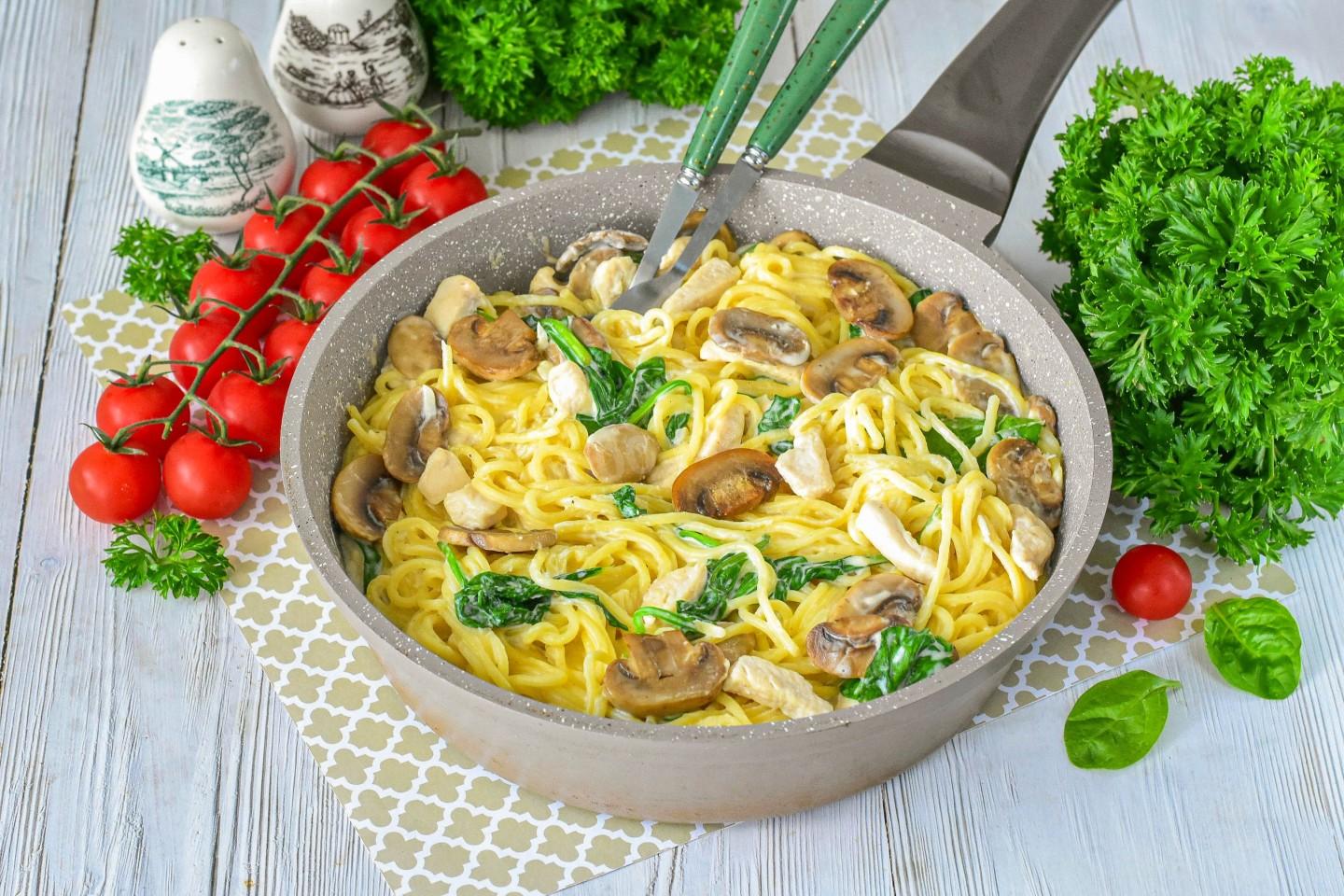 Выложите макароны в сковороду к курице и грибам. Добавьте шпинат и перемешайте. Прогрейте все вместе 1 минуту.