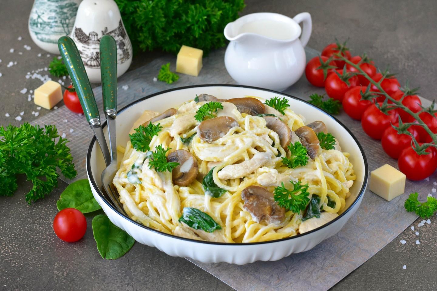 Сливочные пасты с курицей и грибами популярны в итальянской и европейской кухне. Это вариация на тему "паста алла панна", но с добавлением мяса и шампиньонов для большей сытности.