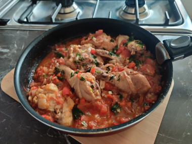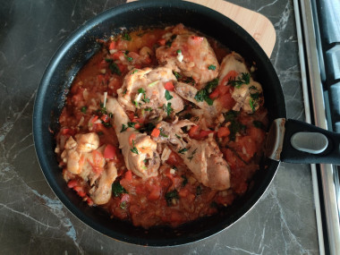 Получилось вкусно и сытно. Курочка стала мягкой и нежной, помидоры придали ей приятную кислинку, а специи и зелень непередаваемый аромат. Соуса, в котором тушилась курочка, осталось довольно много (брала для него две помидорки и одну луковицу). Отварив рис, отправила его на сковородку к курице, получилось замечательное сочное второе.
