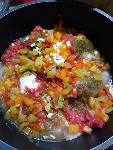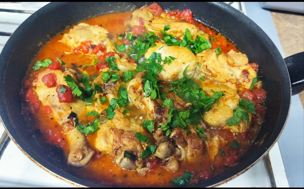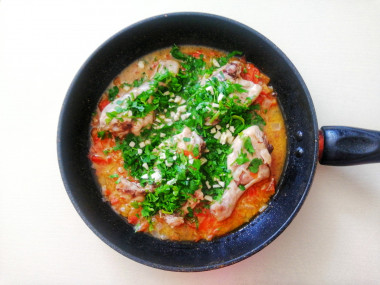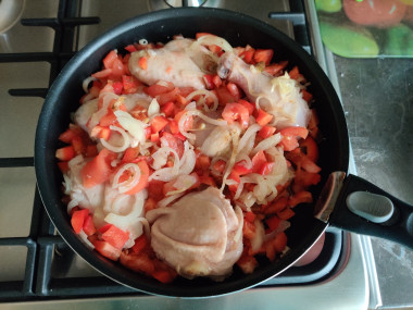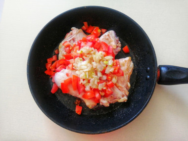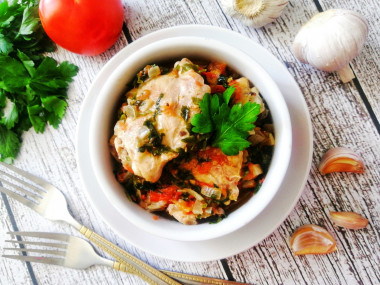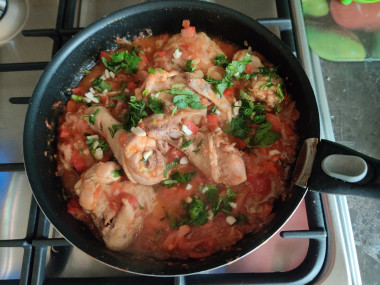Приступив к готовке разрезала два небольших окорочка на части. Обжарила мясо на сухой сковороде по одной минуте с каждой стороны. Затем выложила на курицу нарезанные помидоры, обжаренный на сливочном масле лук, соль, хмели-сунели,черный перец, перемешала. Болгарский перец добавлять не стала. Тушила под крышкой 45 минут. В конце добавила нарезанную петрушку и чеснок. Подержала на огне еще 5 минут и сняла с плиты.