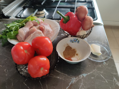 Чахохбили - это то блюдо, для которого целая курица не подходит, мясо должно быть примерно одинаковое по жирности и мягкости. Лучше возьмите окорочка, бедра или голени. Или купите готовый набор для чахохбили. К выбору посуды для приготовления тоже надо подойти внимательно, лучшая посуда - чугунная сковорода или казан, стенки которых нагреваются равномерно. Готовить чахохбили можно как на плите, так и в духовке. Овощей должно быть много, так как курица будет тушиться без воды в овощном соке. Из приправ самая подходящая грузинская хмели-сунели, а из зелени - кинза. Острый перец можно брать как молотый, так и стручковый.