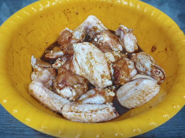 Затем каждое крылышко обмакнуть в маринад и выложить в глубокую миску или кастрюлю. Оставшийся маринад вылить сверху на крылья и накрыть их пищевой пленкой.