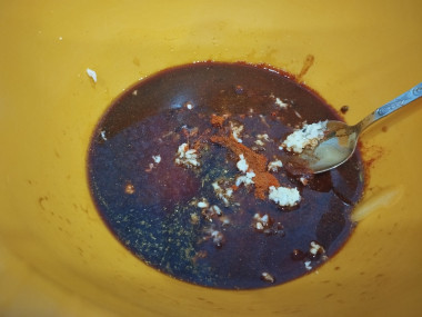 Далее необходимо приготовить маринад. Для этого в миске или большой тарелке смешать соевый соус, мед и все необходимые специи. Если мед сильно густо, то предварительно его можно расплавить на водяной бане или в микроволновке.Чеснок очистить от шелухи, промыть и измельчить через пресс, затем добавить в маринад и тщательно перемешать.