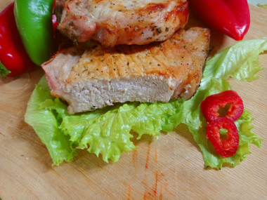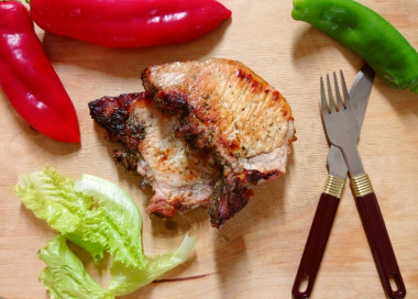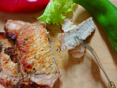 Свинина на противне в духовке пришлась по вкусу всей семье. У меня было пять кусочков свиной корейки на кости (примерно 600 граммов). Мариновалось мясо в течение 40 минут. Паприки и майорана у меня не было. Перец чили я использовала в виде порошка. Еще добавила смесь кавказских трав. Запекала мясо около 35 минут.