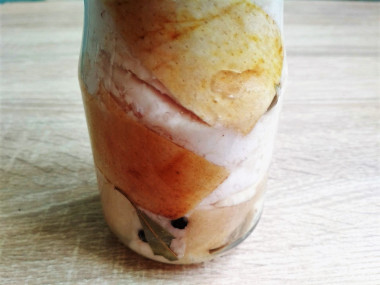 Теперь поместите в банку несколько кусков сала, а сверху выложите ещё пряности. Таким образом заполните полностью банки.
