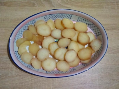 Картофель вымойте, очистите и нарежьте кружочками.