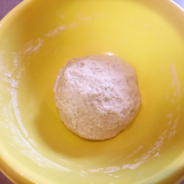 Добавьте в миску с жидкостью просеянную пшеничную муку. Всыпайте ее частями, каждый раз ложкой или деревянной лопаткой промешивая тесто. Когда станет сложно ложкой мешать тесто, выкладываем его на присыпанный мукой стол и при необходимости подсыпая муку, замешиваем гладкое и эластичное тесто. Муки может уйти чуть больше или меньше указанного в ингредиентах количества.