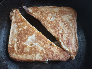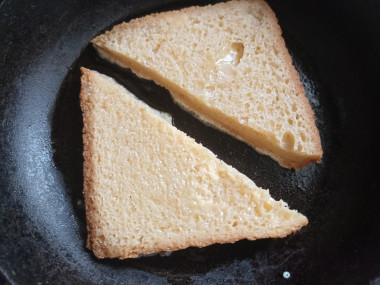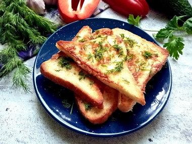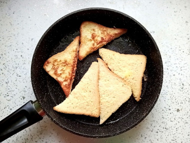 Обжариваем гренки на среднем огне, сначала с одной стороны до румяной корочки, затем переверните и обжаривайте со второй стороны. Накройте сковороду крышкой и держите гренки на сковороде еще около 5 минут.
