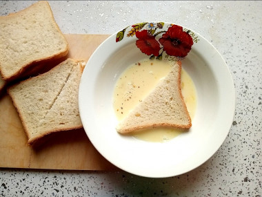 Буханку белого хлеба разрежьте на ломтики толщиной около 1 сантиметра.Тоньше делать не нужно, иначе заливке будет недостаточно места для впитывания, а более толстые куски останутся влажными внутри и могут не прожариться. Ломтики нарежьте треугольниками, если кусочки получаются большие. Также можно оставить ломтики целыми или нарезать их вдоль или поперек.