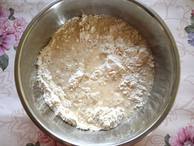 Следом влейте в чашу растительное масло. Постепенно подсыпайте просеянную муку и замешивайте тесто. Муки может потребоваться чуть больше или меньше, чем указано в рецепте. Ориентируйтесь по консистенции готового теста.