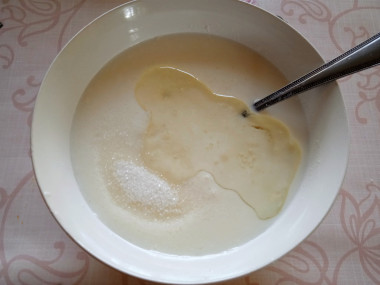 Кефир нагрейте до теплого состояния (34-38 градусов). В теплой среде дрожжи начнут работать более активно. Кефир можно нагреть в микроволновой печи. Но будьте аккуратны, чтобы он не свернулся! Грейте по 5-7 секунд и каждый раз перемешивайте. В просторную чашу налейте теплый кефир и добавьте к нему сухие дрожжи, сахар и соль. Все перемешайте.