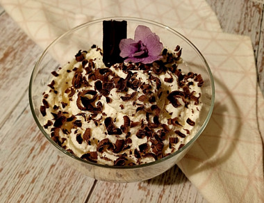 Вечером захотелось чего-то вкусненького, а т. к. я люблю десерты с желатином, то нашла на сайте рецепт сметанного крема с желатином для торта. Правда до торта дело не дошло) Раньше делала подобный десерт, но никогда ещё не пробовала взбивать желе) Все делала по инструкции. Желе быстро застыло в холодильнике. Взбивала я его погружным блендером в высоком стакане. Совсем однородная консистенция не получилась, но крем стал воздушным как облачко. Даже удивительно, что плотное желе превратилось в лёгкий крем) Мне кажется, если сделать прослойку таким кремом в торте, будет очень интересно. Надо обязательно попробовать! На вкус десерт приятный, в меру сладкий, тающий, с ванильным ароматом. Я ещё сверху тёртым шоколадом присылала. Сделала вывод, что надо было побольше порцию делать, очень уж вкусно получилось)