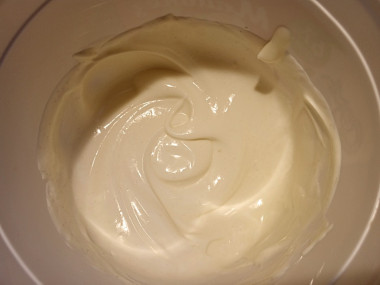 Тем временем в миску выложите сметану, добавьте сахар и щепотку ванилина, большее количество может придать горечь готовому крему. Ванилин своим приятным ароматом замаскирует специфический привкус сметаны. Сметану для такого крема лучше использовать натуральную, обязательно свежую и среднего процента жирности, не слишком жидкую и не слишком густую. Миксером или блендером взбейте сметану с сахаром и ванилином до получения густой и объемной массы.